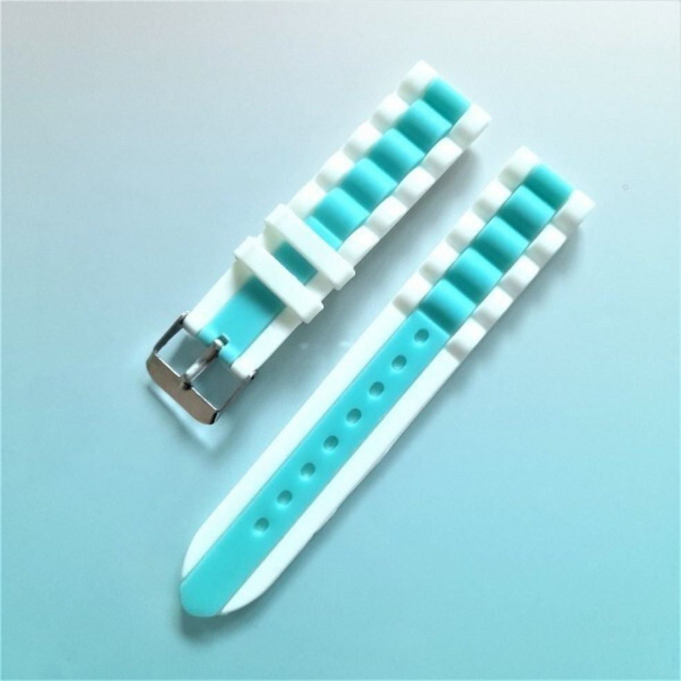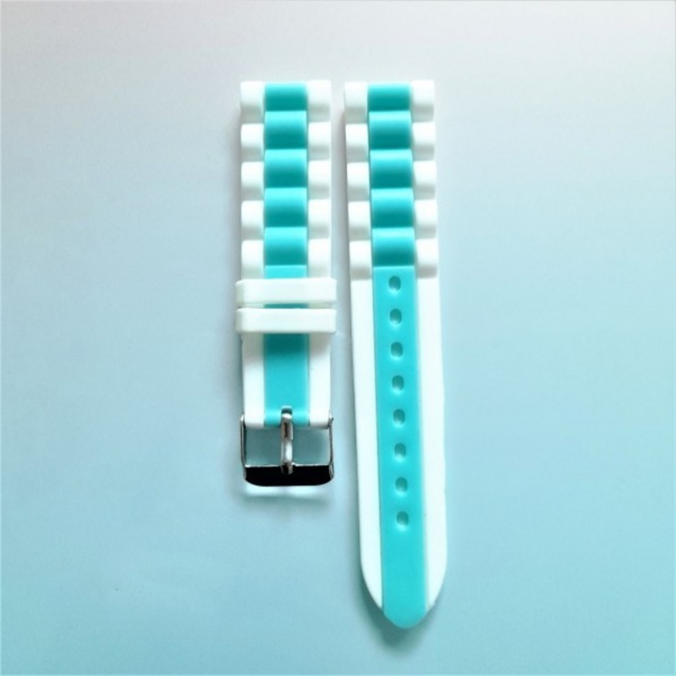 This silicone watch strap features a fresh two-tone design combining white and mint colors.